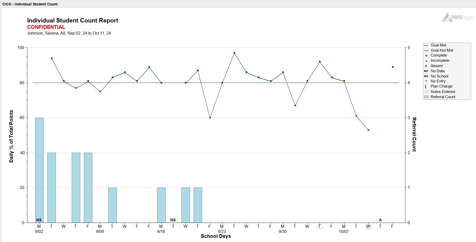 For teams to know whether the intervention is working, you need to set a daily goal each student needs to meet and a goal for the intervention overall. The percent of points each student earns is a good way to measure student success in the CICO intervention. Typically, that goal sits at 80% of the points earned each day...but it doesn’t have to be.