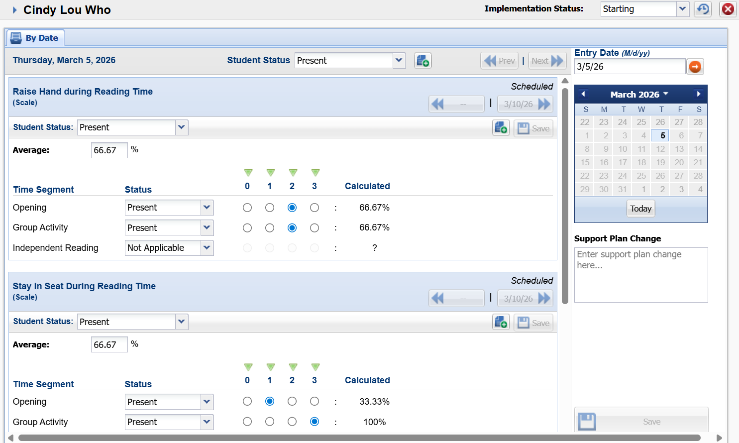 We’ll measure three behaviors during three different activities during reading – our opening activity, our group activity, and our independent reading activity. Her teacher will rate Cindy Lou’s behaviors along a scale of 0 to 3 based on how consistently she’s able to follow expectations. In I-SWIS, her point card looks like this. If you want to set up something similar in your account, here’s a template to follow.