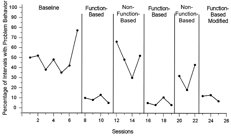 The figure above is from a student named Carter. Carter’s problem behaviors meant he was disengaged from class about 50% of the time. The hypothesis was Carter wanted to avoid difficult tasks. The functional solution they implemented let him take a break sometimes. The non-functional solution relied on the school-wide approaches for problem behaviors: teachers reminded Carter of the classroom expectations and gave him a reward ticket when he behaved appropriately. The function-based intervention not only decreased his problem behavior, but also created consistency in his behavior.