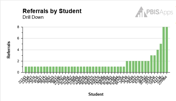 Now, with this rule, we don’t literally mean 10 students or 10%. The numbers serve as reminders: do we have a small group of students or a whole lot of students contributing to the issue we’re trying to solve? If we go back to our 500-student example, let’s say our team used the Drill Down Tool to come up with a precise problem statement. We flip the graph type to Student and see the following: